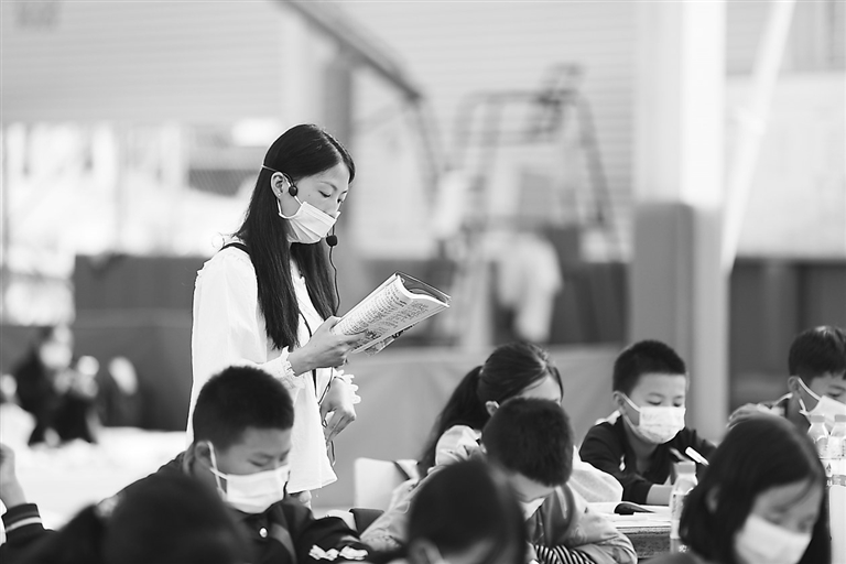 9月14日,在石棉县王岗坪乡,老师在国家能源集团大渡河大岗山公司提供的场地为学生们讲课。9月14日,泸定县6所小学、幼儿园恢复线下上课,石棉县三个受灾乡镇学校也逐步复课。新华社记者 刘 琼摄