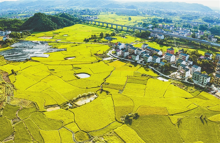 9月14日,航拍下的上饶市广丰区壶峤镇优质稻种植基地,1000亩水稻长势喜人,勾勒出乡村好“丰”景。通讯员 潘 栋摄