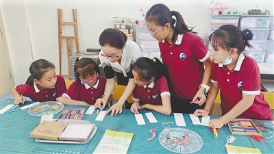 下午4时,扬子洲学校五年级正在开展创意压花教学。在观看完压花书签制作视频后,同学们纷纷拿出材料,在熊立庆老师的指导下动手制作。