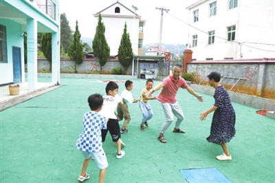 9月2日,开学第一天。在莲花县南岭乡最偏僻的教学点——千坊教学点,王顺文和妻子李小艳带着五个孩子一起升国旗、上课、做游戏。今年48岁的王顺文,1993年中专毕业后一直在乡村学校任教,去年他和妻子主动要求来到这个“微型”学校任教。贺治斌摄
