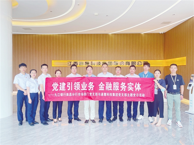 近日,九江银行南昌分行市场部门党支部与江西通慧科技集团股份有限公司党支部联合开展“党建引领业务,金融服务实体”主题党日活动。据悉,江西通慧科技集团股份有限公司是我省“映山红行动”重点上市后备企业、省级“专精特新”企业,九江银行南昌分行坚持党建引领,为该企业提供专属金融服务,助力其高质量发展。方 曦摄