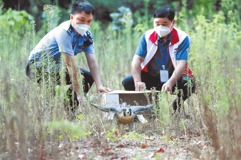 9月18日,在峡江县玉笥山自然保护区,工作人员将一只游隼幼鸟放归山林。近年来,峡江县加大森林资源保护力度,生态环境不断改善,野生动物种类数量也越来越多。 特约通讯员 陈福平摄