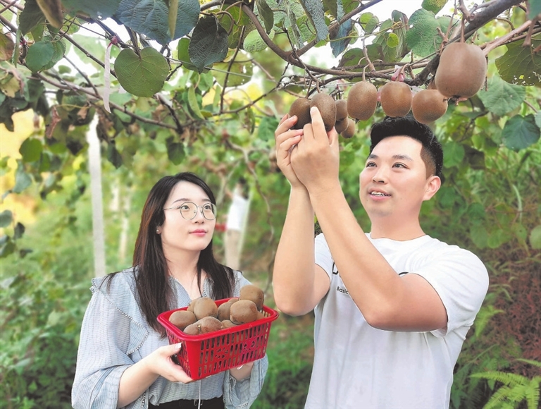 9月18日,在宜春市袁州区新田镇施家村果园基地,游客正在采摘猕猴桃。该镇大力培育家庭农场、农民专业合作社等新型农业经营主体,助力乡村振兴。通讯员 叶 翔摄