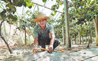 9月20日,德兴市张村乡界田村,种植户在给猕猴桃果树浇灌。干旱天气持续,当地果农通过打井引水的方式,接水管给作物浇灌,保障水果生产和供应。