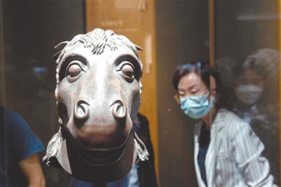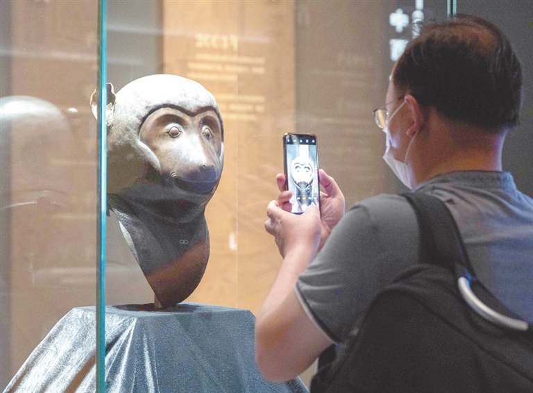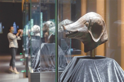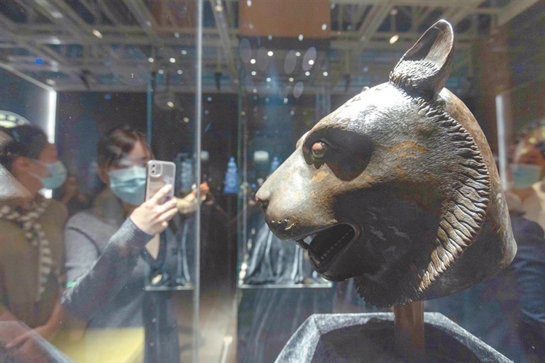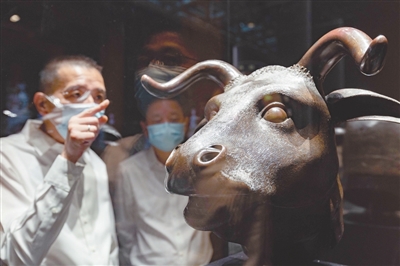 9月26日,“盛世回归——海外回流文物特展”在上海市闵行区博物馆开幕,展览包括“盛世重逢”和“华美赓续”两个部分,汇聚了来自保利艺术博物馆和北京市海淀区圆明园管理处的47件精美文物,均为海外回流精品文物。展品包括清代圆明园海晏堂十二生肖之牛首、虎首、猴首、猪首青铜兽首原件、马首复制件,以及商周、春秋战国、两汉时期国宝级青铜重器。新华社记者 王 翔摄