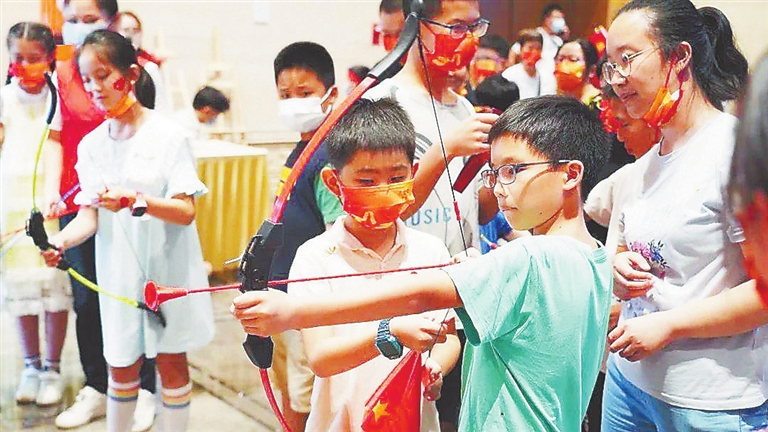 10月7日晚,高悬的红旗、错落有致的红星,在草坪上散发光芒,省博物馆处处呈现出热烈的气氛。夜幕降临,博物馆正门外,观众已经排起了长队,在防疫安检人员的引导下有条不紊地入馆,领取国庆“氛围组合”。从10月1日起,省博开启“夜场模式”,从首饰制作到书画赏析,从积木拼搭到植物扎染,市民可以在这里穿越不同时空,体验奇妙古今互动。七天长假,省博物馆以亲切、生动、温暖的姿态,成为南昌人频频打卡光顾的热门之选。