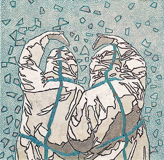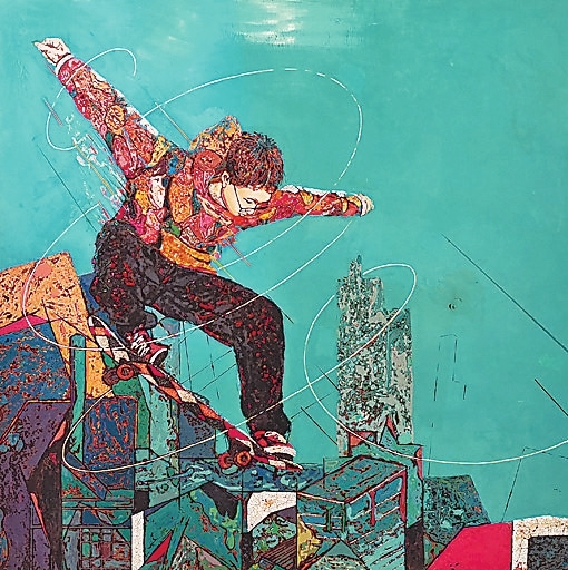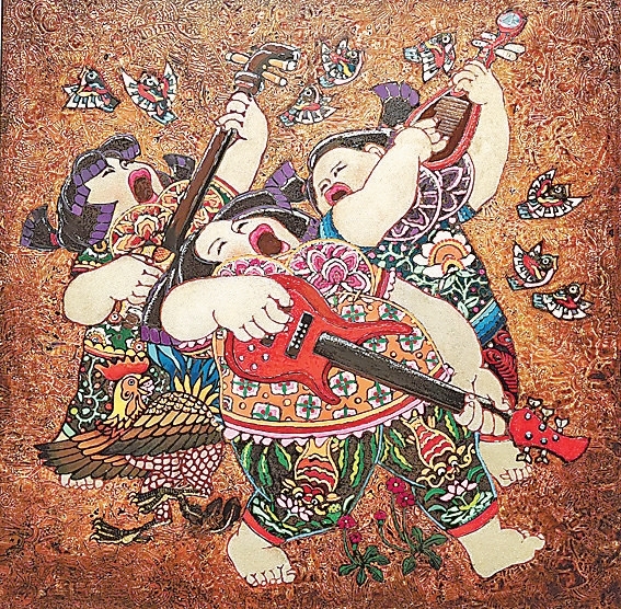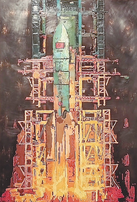 主旋律作品在展厅中尤为吸引眼球,且佳作不少。曾嘉仪的《星河征途》(图1),中国火箭已经点火,即将升入深邃的太空,表现了我国航天事业所取得的伟大成就。刘杨的《背影》(图2),以小细节表现大主题,两名白衣天使比出“爱心”手势,互相鼓励,为使命出征,此时无声胜有声。甘勋优的《乐小康》(图3),三个小歌手尽情歌舞,表达出对小康生活的赞美之情。人物运用夸张艺术手法,画面富有年画意味,给人印象深刻。韩磊的《时和年丰》(图4),构思巧妙,构图新颖,从描绘累累果实这一独特角度,讴歌人民生活幸福、社会和谐的新时代。