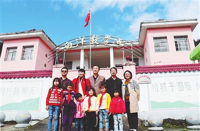 2021年11月7日,奉新县澡下镇白洋教学点,江西日报社退休记者蔡卓凡、宜春分社记者邹海斌、“全国最美奋斗者”支月英,在蓝天白云下,与教学点孩子们合影。