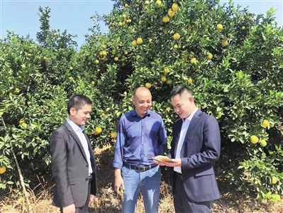 今年以来,邮储银行安远县支行不断加强“信用村”宣传,用普惠政策润泽农村、农业发展,该支行累计为农户投放贷款达6亿元,惠及客户超1377人次。图为邮储银行安远县支行客户经理走访车头村脐橙果园。卢玲娟摄