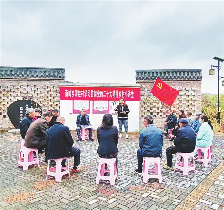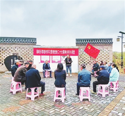 近期,莲花县南岭乡组建“乡音”宣讲队,通过入户、农村大喇叭、乡村小讲堂等方式,用“乡音”传递“党音”,将党的二十大精神传递到千家万户。图为该乡四桂村党支部书记胡琼向村民宣讲党的二十大精神。甘惠艳摄