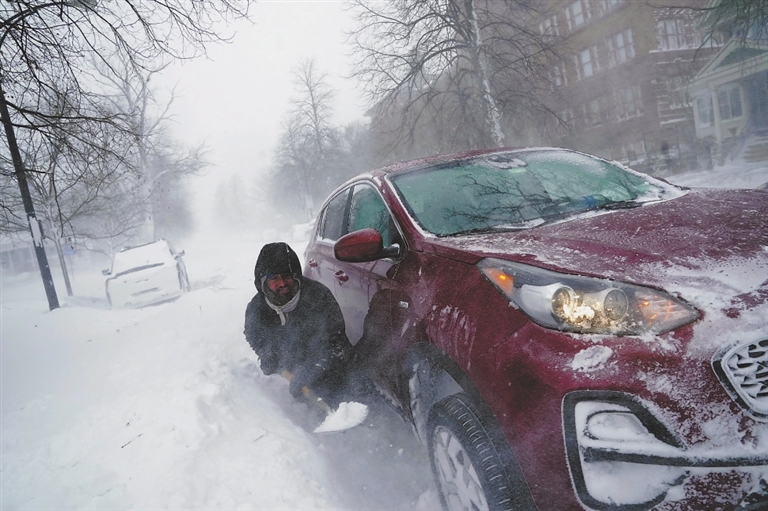 12月24日,一名男子在美国布法罗清理汽车旁的积雪。一场规模罕见的寒潮23日横扫美国,航班大规模取消或延误,道路交通受阻,电力供应中断。冬季风暴24日继续在美国部分地区肆虐,已经导致大约20人死亡。据新华社/美联
