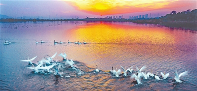 12月25日,一群小天鹅在九江市柴桑区港口街镇天鹅湖嬉戏觅食。傍晚时分,夕阳染红了湖面,候鸟时而低飞、时而群舞,时而追逐打闹、时而安静游玩,天光云影的天鹅湖因此多了几分灵动之美。本报全媒体记者 梁振堂摄