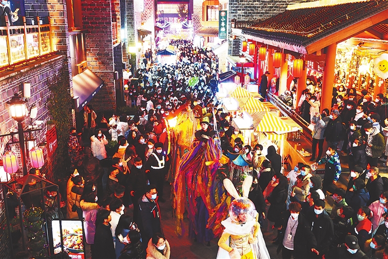 2022年12月31日,南昌市万寿宫历史文化街区人山人海,市民们在这里看民俗表演、吃特色美食,迎接新年的到来。 本报全媒体记者 洪子波摄
