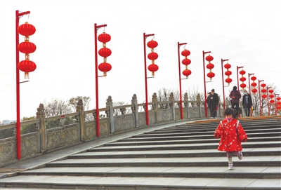 1月5日,在位于南昌市青云谱区的象湖湿地公园,市民从挂满灯笼的桥头走过。春节临近,南昌街头处处张灯结彩,喜庆的节日氛围日渐浓厚。本报全媒体记者 徐 铮摄