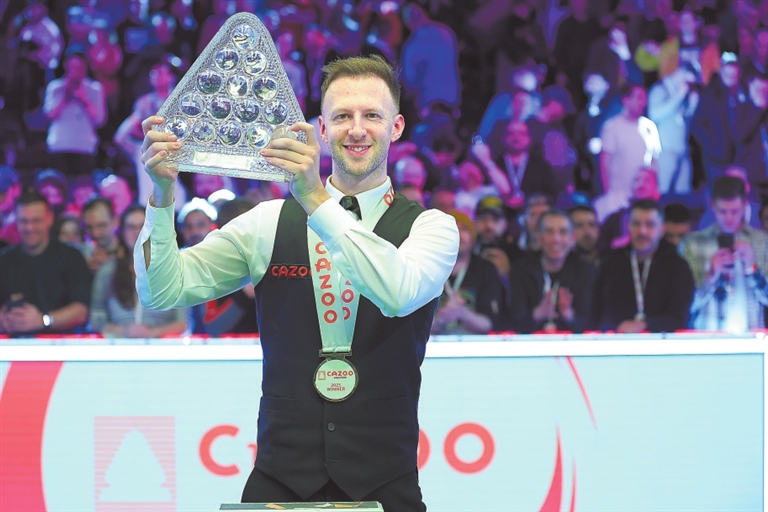 1月15日,特鲁姆普手捧奖杯,庆祝夺冠。当日,在英国伦敦举行的2023斯诺克大师赛决赛中,英格兰选手特鲁姆普以10:8战胜威尔士选手威廉姆斯,获得冠军。 新华社发(翟政摄)