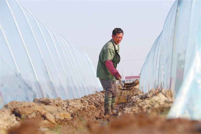 1月28日,奉新县干洲镇岗前村大棚西瓜种植基地,瓜农正在清理沟渠。一年之计在于春,当地农民抢抓晴好天气,积极开展春耕春播。