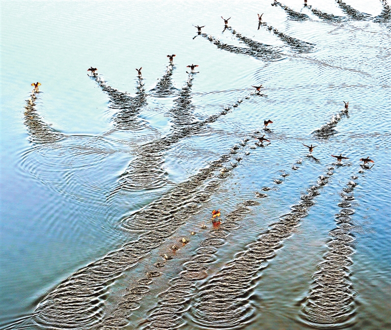2月11日,在永丰县恩江湿地公园,一群小䴙䴘在水中嬉戏觅食,呈现一幅和谐美丽的自然生态画卷。
