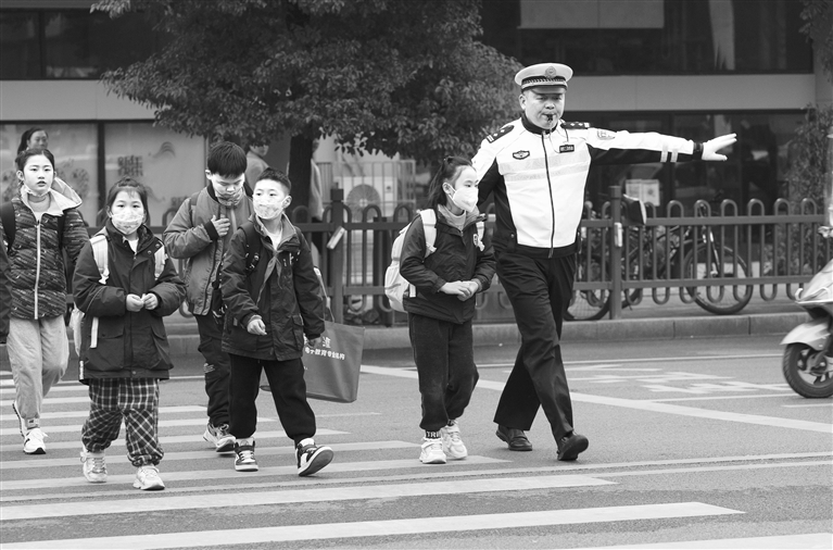 ▲3月1日,新余市公安局交警支队城北大队民警护送学生安全过马路。新余市全年常态化设置79个“雷锋护学岗”,日均投入警力300多人次,联合学校志愿服务队为学生保驾护航。 特约通讯员 赵春亮摄