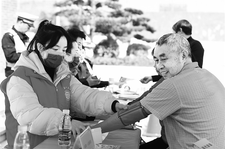 ◀3月1日,在定南县定南之窗广场,医疗卫生志愿服务队队员在给市民测量血压。近日,该县青年志愿者走进乡镇、社区开展志愿服务,以实际行动弘扬雷锋精神。 特约通讯员 詹继成摄