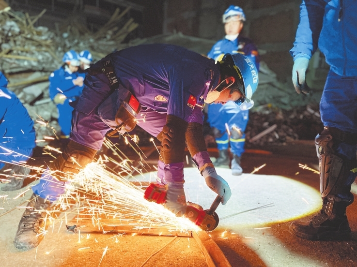 时间就是生命。他们与当地救援力量立即开始挖掘,操持着笨重的圆盘锯、大电镐进行破拆搜救。