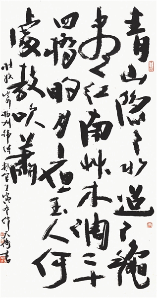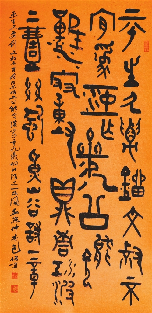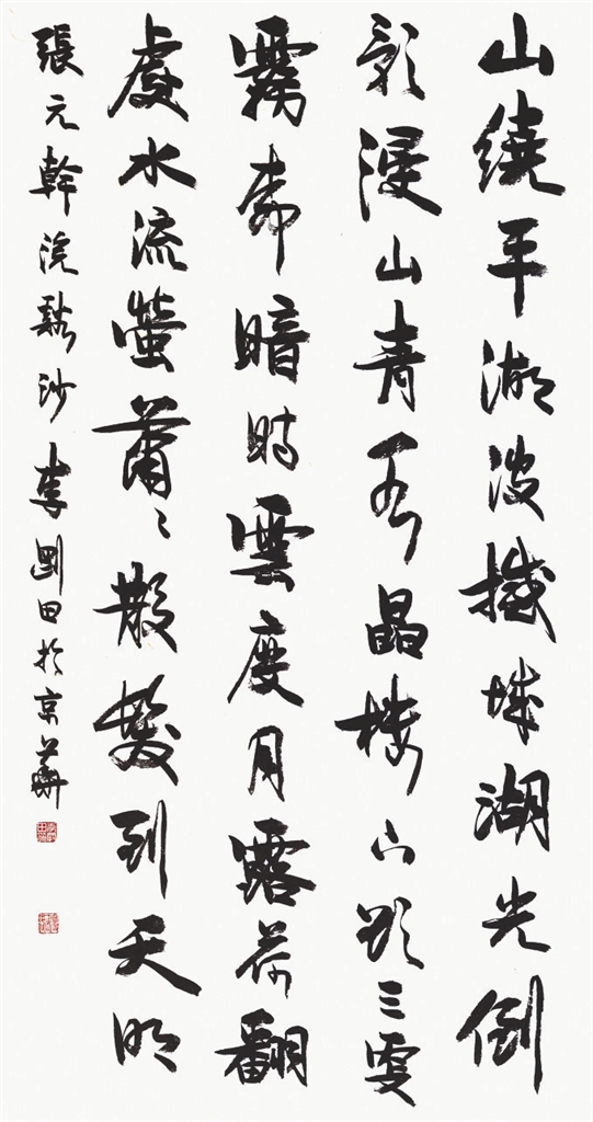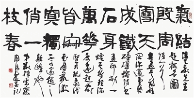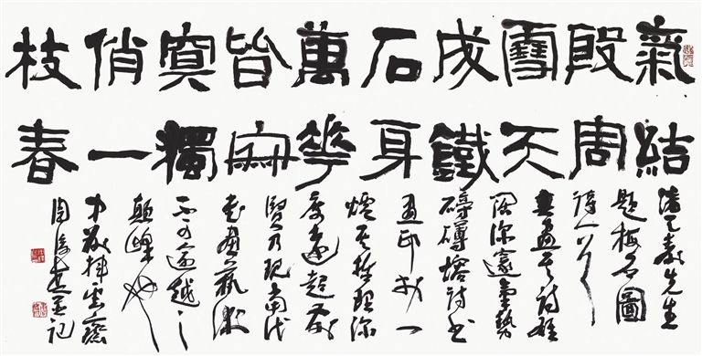 本次受邀参展的41年前参加过全国中青年书法家作品邀请展的部分老书法家,有许多是德艺双馨的全国著名书法家。譬如,当年河南的李刚田,书法和篆刻线条均具有刚健沉着的鲜明个性。这件参展作品(图1),书体以行书、楷书为主,间糅“湖”“城”“水”“下”“欲”等草书,多种书体和谐共融。上海的韩天衡也是书法、篆刻并驾齐驱。这件展出的书法作品(图2),是去年冬专为此展所作,线条浑厚,结体端严,章法处理上大小字穿插,耐人寻味。贵州包俊宜的参展作品(图3)也是创作于去年,内容为黄山谷诗,字体属金文,取法商周时代钟鼎铜器铭文,字型古拙,富有妙趣。浙江王冬龄的参展作品,线条缠绕似有清人傅山意味,柔中有骨,风格率意浪漫。江苏徐利明的横批作品“取精用弘”,结体奇崛,线条洗练,枯润相宜,是作者的典型书风。河南书家周俊杰的这件隶书作品(图4),章法别具一格,上半部分主体为隶书,内容为《潘天寿题梅石图》,线条刚猛,给人一种力量感;下半部分为草书落款,主要评价潘天寿的艺术成就。上下两部分浑然一体,实为少字数内容书法章法的范例。