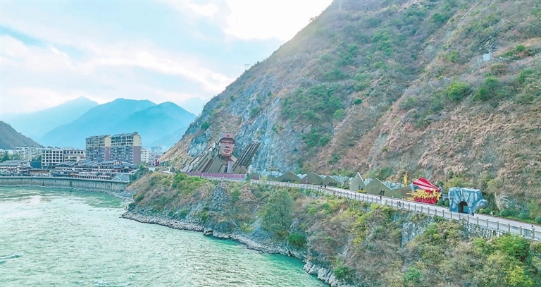 往西穿过泸定桥,一座巨大的红军雕像分外显眼。这是长征国家文化公园泸定段的重点改造项目——勇士路。