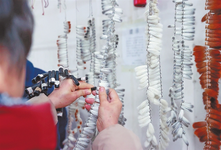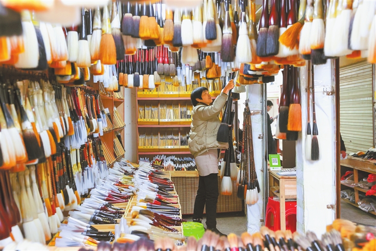 文港毛笔制作始于1600多年前,明清时期日渐繁盛,至今文港几乎“家家出笔工,户户会制笔”,呈现出“笔不到文港不齐”的盛况。据传,唐朝时文港已出现笔市。“改革开放后,传统的文港毛笔生产企业和家庭作坊如雨后春笋般生长起来,目前文港镇拥有毛笔生产企业和作坊2600余家,2022年全镇产销毛笔9.5亿支,占据全国毛笔约75%的市场份额,文港笔市已经成为全国最大的毛笔市场。”文港文房四宝协会会长吴国华自豪地向记者介绍。如今,文港笔市每逢农历一、四、七开市,吸引着全国各地制笔商和材料商前来赶集选购。
