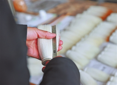 出门一担笔,回家一担皮。千百年来,制笔、收皮、卖笔成为文港人生活的“三部曲”。“集市五点半就开场,首先进场的笔匠大都是周边的农户,售卖的是他们农闲之余制作的入门级书法用笔和学生用笔的笔头。”吴国华说,“八点半后,材料区、笔头区、笔杆区等区域的商户陆续到齐,笔市就十分热闹了。”