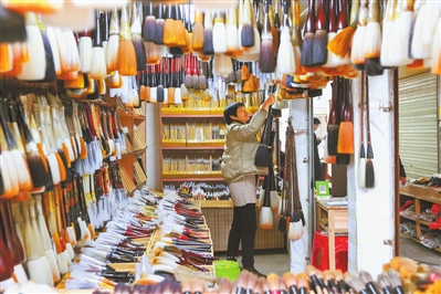 上午9时,笔市已是人头攒动,摩肩接踵。笔之所贵在于毫,兼毫、狼毫、羊毫、紫毫……各种笔头应有尽有;铜杆、竹杆、木杆……各种笔杆琳琅满目;小如针尖的细笔、大似扫帚的抓笔、油画笔、勾线笔,各种成品笔让人目不暇接。客商穿梭其间,看材质,比工艺,东家买笔头,西家配笔杆,忙得不亦乐乎。