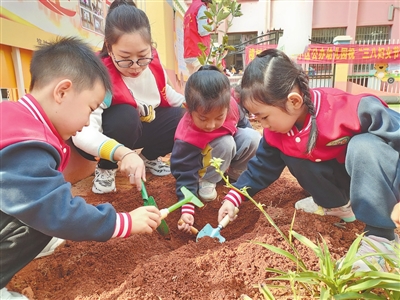 3月10日,樟树市淦阳街道志愿者和幼儿园小朋友在江南华城小区开展护绿植树活动。通讯员 彭 琳摄