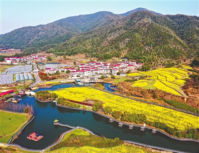 3月13日,无人机航拍南昌市湾里管理局太平镇泮溪村,金黄的油菜花与一幢幢农村楼房相互映衬,构成一幅秀美乡村画卷。近年来,该村依托丰富的旅游资源办民宿、开农家乐,家家吃上了旅游饭。本报全媒体记者 洪子波摄