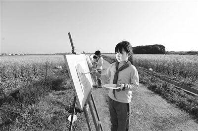 3月6日,抚州市东乡区珀玕乡珀玕小学学生正在进行户外写生,用画笔描绘油菜花的美景,感受春天的气息。