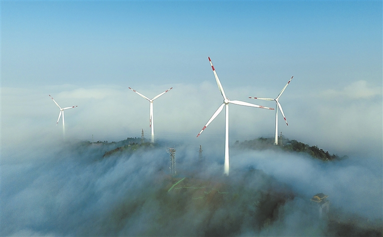 3月10日,位于鄱阳湖畔的都昌矶山风电场,一座座风力发电机在云海间若隐若现,景色如画。