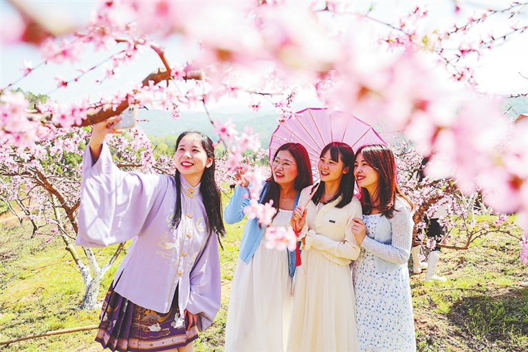 3月14日,游客在广昌县水南圩乡大庄村杨家岭黄桃种植基地赏花拍照。连日来,该基地种植的30多亩黄桃花竞相盛开,吸引众多游客前来踏春观光。 特约通讯员 曾恒贵摄