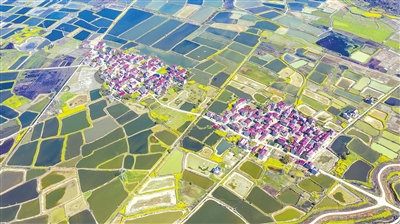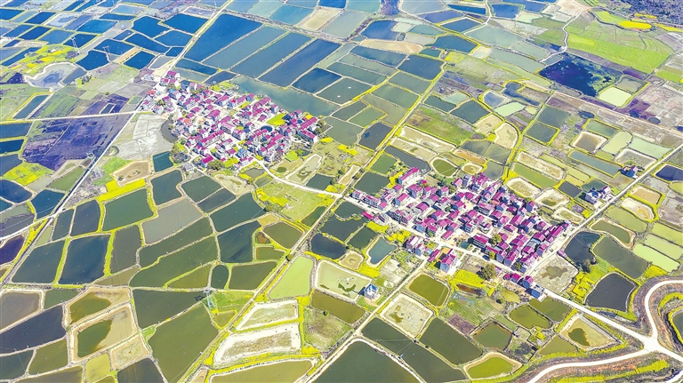 3月14日,航拍下的樟树市洋湖乡双溪村,纵横交错的鱼塘与油菜花、村舍交相辉映,美不胜收。特约通讯员 周 亮摄