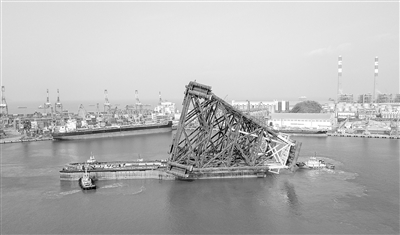 3月17日,在深圳赤湾海洋工程码头,“海洋石油228”运输驳船搭载着恩平20-4平台导管架启航(无人机照片)。
