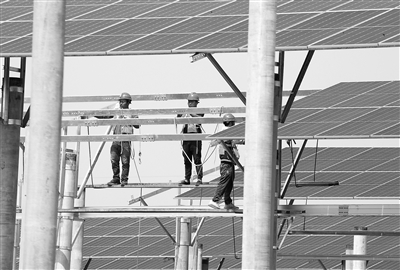 3月16日,在位于抚州市东乡区杨桥殿镇的华润抚州东乡渔光互补光伏发电项目基地,工人正在安装光伏电板。据悉,该项目占地面积2883亩,建成后电站年平均上网电量2.17亿千瓦时,每年可节约标准煤6.86万吨,减少二氧化碳排放量16.86万吨,实现节能减排、生态水产养殖、农业休闲观光于一体的集成效果。