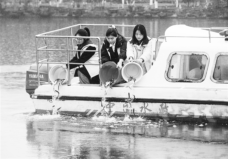 3月21日,在浙江省宁波市北仑区东泰河,志愿者将鱼苗放流入河。 新华社发(索向鲁摄)