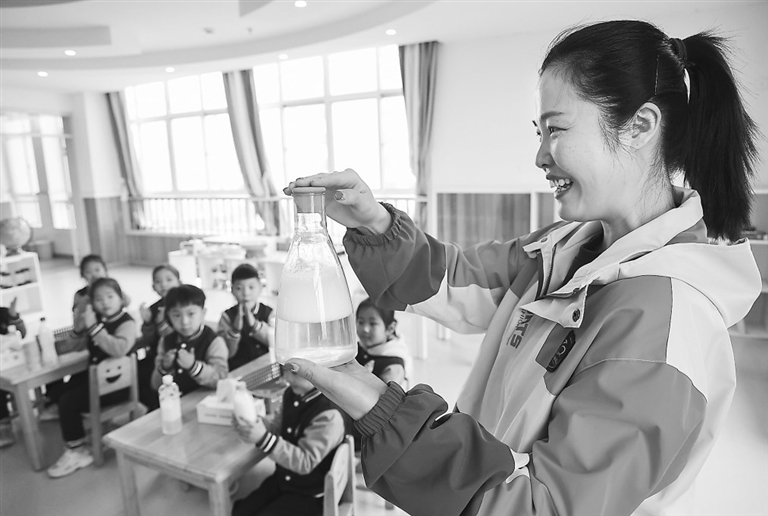 3月21日,山东省临沂市兰山区柳青街道中心幼儿园的老师为孩子们演示污水治理小实验。 新华社发(许传宝摄)