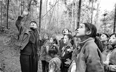 近日,奉新县澡下镇白洋教学点,支月英在竹林里给学生们上自然课。南昌市城北学校师生们来到支月英扎根43年的深山教学点,通过听一堂自然课、玩一场小游戏等活动,传递大爱与奉献精神。本报全媒体记者 徐 铮摄