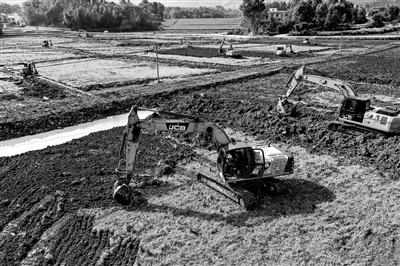 3月13日,萍乡市湘东区麻山镇横岗村高标准农田项目建设现场,14台挖掘机在田间往来作业,平整土地。当地政府投资900余万元,对该村2000余亩土地进行统一平整、格田成方,并开展灌溉与排水措施建设,提升整体灌排能力,为春耕生产提供保障。本报全媒体记者 史港泽摄