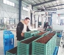 3月16日,在幽兰镇印智农业万亩集中育秧中心内,一条10余米长的自动化育秧流水线正开足马力运行。传送带上,一个个育秧盘排着队,经过自动填土、播种、覆土等程序,再集中送往温室发芽。据介绍,一条自动化育秧流水线1个小时能完成2400个秧盘,可供近100亩田地用秧。