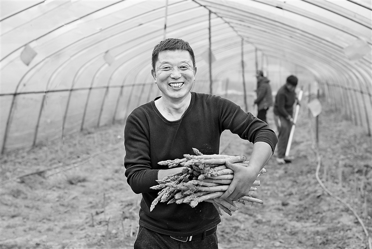 ◀日前,在万年县万水家庭农场芦笋种植基地,农民正在采摘芦笋。基地内芦笋长势喜人,亩产可达2000公斤,亩均收入3万余元,产品除本地畅销外,还远销南昌等地。特约通讯员 徐声高摄