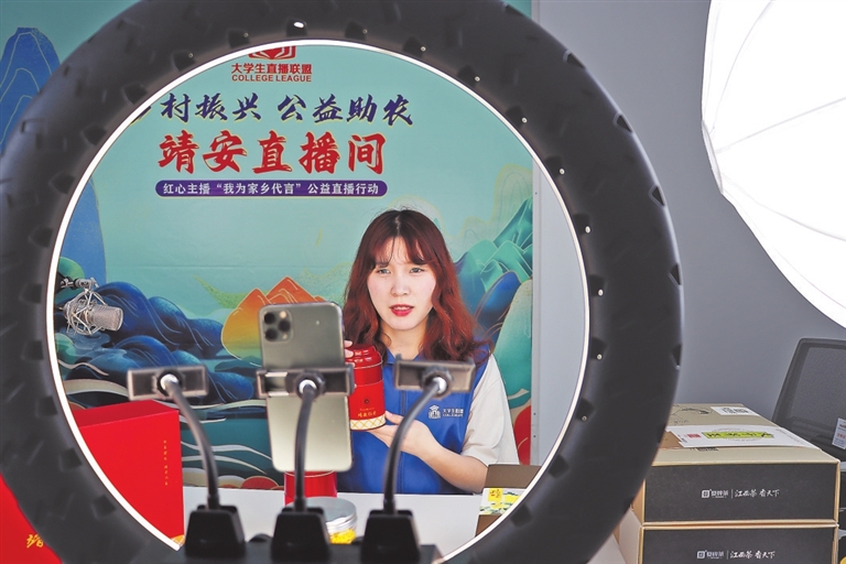 3月31日,宜春幼儿师范高等专科学校学生在直播。该校大学生直播电商创业基地开展“我为家乡代言”公益直播行动,鼓励青年学子参与直播助农、电商创业,助力乡村振兴。本报全媒体记者 邹海斌摄