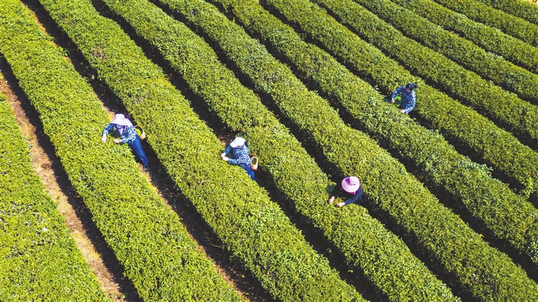 4月1日,修水县大椿乡茶农在茶叶基地采摘春茶。大椿被誉为“万亩有机茶之乡”,全乡有茶园面积1.4万余亩,成规模茶企9家,茶农有1500多户,是修水县茶叶种植面积最大的乡镇。该乡以茶兴乡,以茶富农,全乡共有茶叶品牌7个,以宁红茶、双井绿、龙须茶等极具本土特色和美誉度的茶叶品种为主。 本报全媒体记者 梁振堂摄