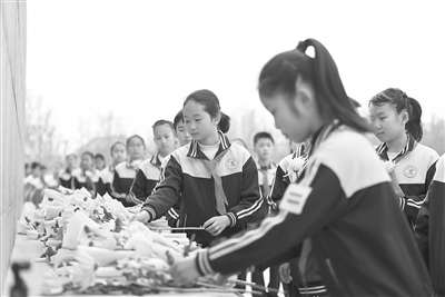 在天津市烈士陵园,学生代表向烈士纪念碑敬献鲜花。新华社记者 赵子硕摄