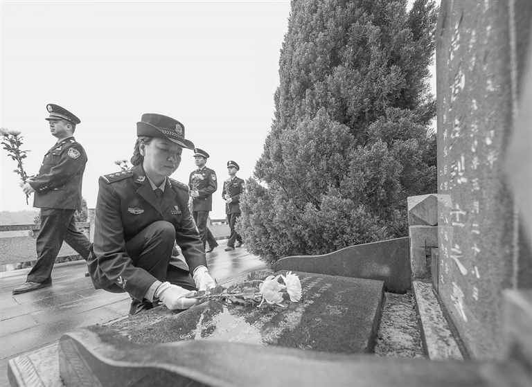 成都铁路公安局贵阳公安处铜仁南车站派出所民警在小凤山烈士陵园向烈士墓敬献鲜花。新华社发(胡攀学摄)