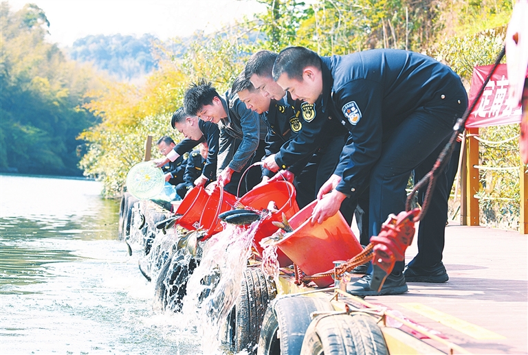 近日,定南县检察院联合县农业农村局、县水利局和县生态环境局等部门,在九曲河边开展了一场特殊的“生态环境损害赔偿增殖放流”活动,向九曲河投入了总价值6000元的2000余尾鱼苗。该笔鱼苗费用,全部由两名违法电鱼当事人“买单”,偿还自己欠下的“生态债”。