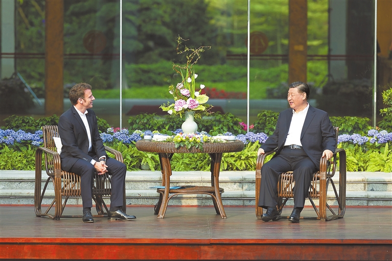 习近平指出,这两天,我们在北京和广州进行了深入、高质量交流,增进了了解和互信,为今后中法两国在双边和国际层面的合作明确了方向。很高兴我们在中法、中欧关系以及很多国际和地区问题上有很多相同或相似看法,这体现了中法关系的高水平和战略性。我愿同你继续保持密切战略沟通,推动中法全面战略伙伴关系提升至新高度。