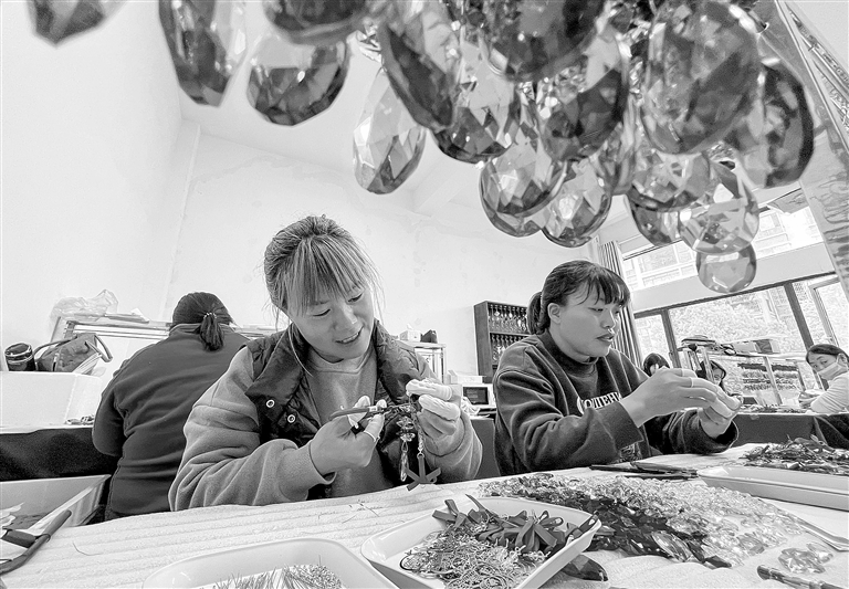 ▲4月6日,群众正在赶制手工艺品订单。为解决搬迁移民灵活就业,武宁县将工厂建到群众家门口,促进就地就近就业增收。本报全媒体记者 史港泽摄